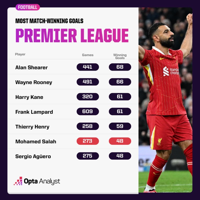 上周末,利物浦在主场以2-1逆转击败布莱顿的比赛中,埃及球星萨拉赫为红军打入了反超比分的进球。这个进球不仅帮助球队取得胜利,同时也让萨拉赫的英超生涯制胜球数达到了48个,追平了曼城传奇前锋阿圭罗,两人并列英超历史第六。